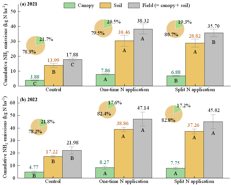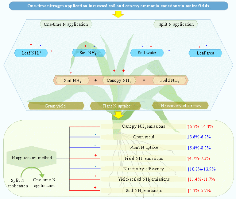 研究發現,土壤和玉米冠層氨揮發量分別占田間氨揮發量的78.2%-82.8%和17.2%-21.8%。與分次施氮相比,一次性施氮使冠層氨揮發量增加6.7%-14.3%,土壤氨揮發量提高4.3%-5.7%,產量尺度氨揮發量增加11.4%-11.7%;而糧食產量降低3.6%-6.2%,氮素回收效率降低10.2%-13.9%。一次性施氮條件下,較高土壤銨態氮濃度、較低的土壤含水量、較大的葉片質外體銨態氮濃度和葉面積,是激發其土壤和冠層氨揮發的關鍵原因。上述結果加深了對土壤和冠層氨揮發的理解,為優化玉米施氮策略、減少農田氮素損失提供了新依據。
