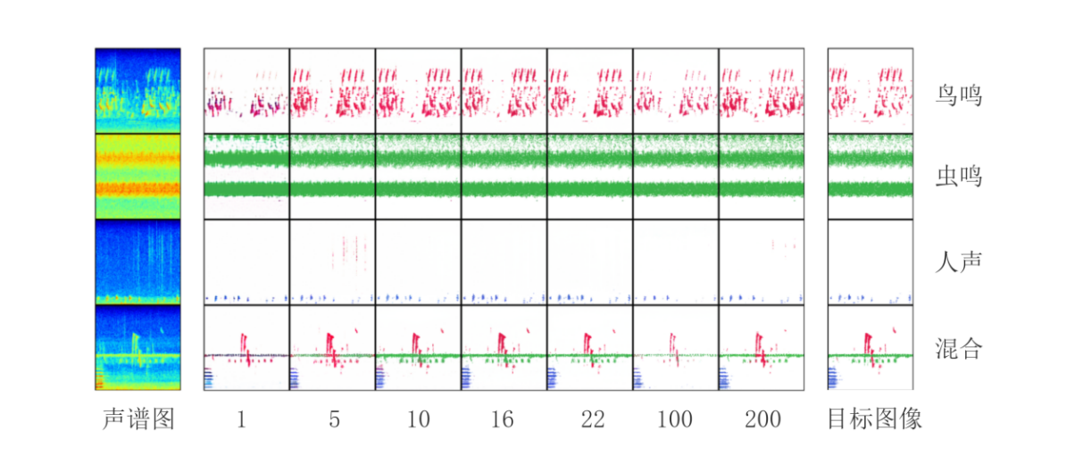 在自然生態系統中,鳥類、昆蟲等動物的鳴叫聲,以及風聲、雨聲和人類活動聲音共同構成了完整的生態聲音景觀。由于不同物種鳴叫頻率不同,研究人員可通過聲音頻譜圖,從生態聲音景觀中解析出物種多樣性信息。近年來,判別式機器學習方法被廣泛應用于聲音景觀解析,以監測生態系統物種多樣性及其時空變化。然而,對于物種豐富、聲源復雜的生態系統,難以從聲音景觀中準確鑒別物種和估算物種多樣性,這給基于生態聲音景觀的生態監測帶來了挑戰。
