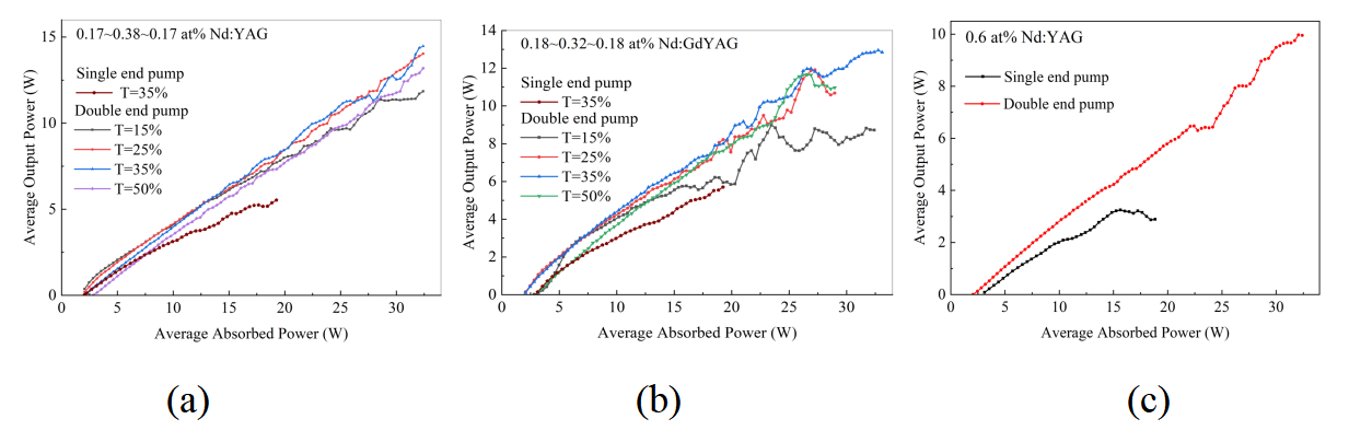 圖3 激光性能:(a)0.17~0.38~0.17 at% Nd:YAG; (b)0.18~0.32~0.18 at% Nd:GdYAG; (c)0.6 at% Nd:YAG