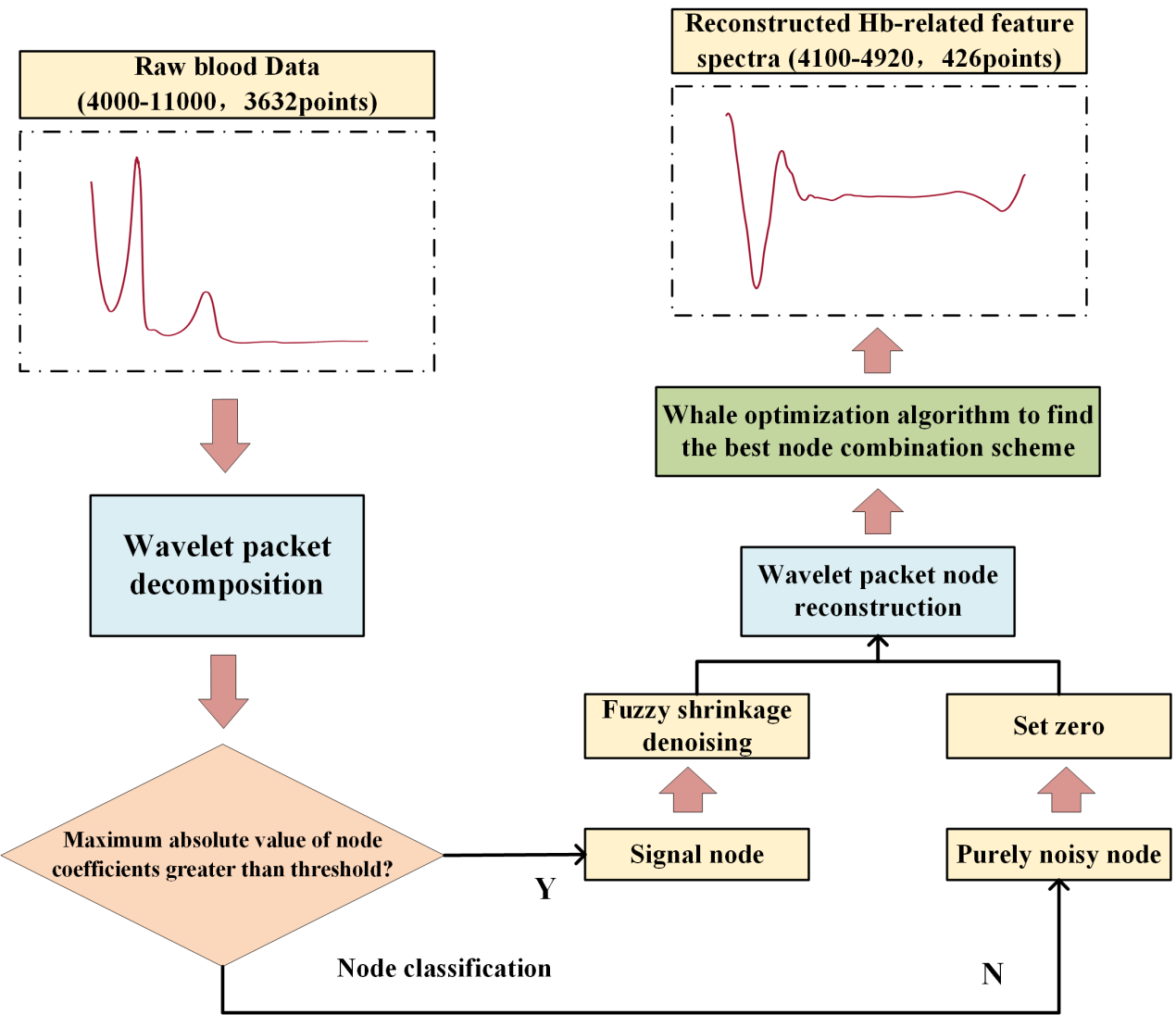 NIRS具有便捷、無創、靈敏等優勢,但在全血檢測中,強烈的水吸收、樣品散射與儀器噪聲等會顯著淹沒血紅蛋白(Hb)微弱吸收特征,制約定量精度。針對這一難題,研究團隊提出一項一體化處理與檢索新方法:將小波包-模糊收縮去噪(WPT-FS)與鯨魚優化算法(WOA)相結合,先以自適應的“模糊收縮”閾值函數在多尺度上抑制噪聲、保留潛在有效系數,再利用群智能優化在高維節點空間中搜索最優特征節點組合,重構富含Hb信息的特征光譜,并基于偏最小二乘(PLS)完成定量建模。