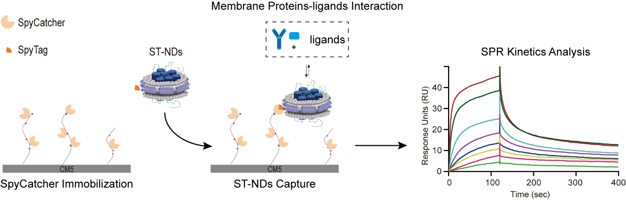 針對該瓶頸,研究團隊創新性地將SpyCatcher-SpyTag共價偶聯系統與膜支架蛋白(MSP)介導的脂質納米盤技術相結合,開發出一種操作簡便、高效穩定的膜蛋白芯片固定新策略。該方法通過柔性鏈接構建MSP-SpyTag融合蛋白,進而利用其將目標膜蛋白組裝至脂質納米盤內;所得的納米盤攜帶SpyTag標簽,能夠與預先通過常規氨基偶聯法固定于CM5芯片表面的SpyCatcher蛋白發生高效、特異的共價結合而被精準捕獲,從而實現膜蛋白在近生理膜環境下的高效、穩定固定。