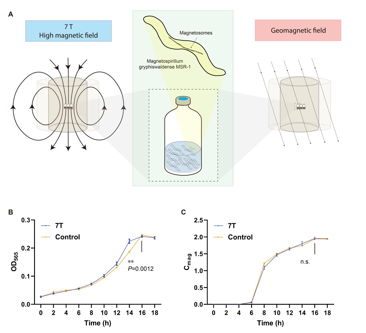 趨磁細菌是一類典型磁感應的微生物,在地球磁場這部“天然導航儀”的指引下,趨磁細菌憑借細胞內由納米級磁小體排列而成的“生物磁針”,可沿磁力線精準定向運動。這一獨特能力不僅幫助它們在復雜水體環境中快速鎖定最適生境,也為解析磁場與生物體耦合機制提供了理想模型。大量實驗證實,地磁場在趨磁細菌生長調控、代謝適應以及磁小體生物礦化過程中發揮關鍵作用,然而,現有研究多聚焦于天然地磁場范圍內的感應與響應,高強度磁場下趨磁細菌的生物學行為仍是“盲區”。