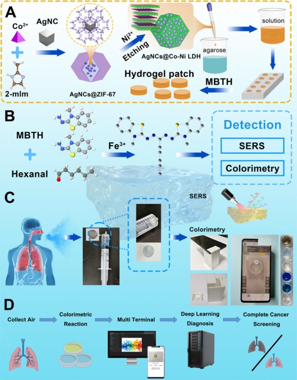 構建AgNCs@Co-Ni LDH為功能基質的水凝膠傳感貼片,通過SERS與比色雙模測量方式檢測痕量VOC氣體標志物,并結合智能手機以及相關深度學習算法,以應用于肺癌無創早篩。