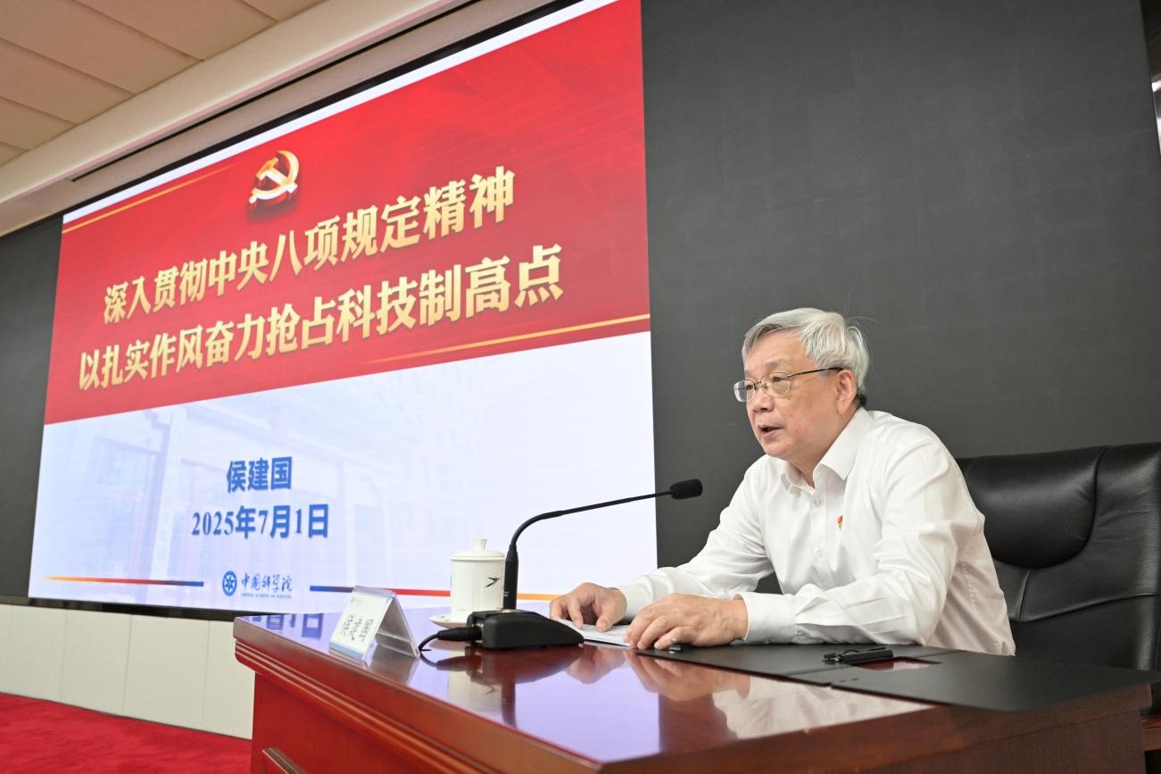 侯建國對鍥而不舍落實中央八項規定精神提出四點要求。一是要錘煉黨性修養、深化學習教育,確保學有質量、查有力度、改有成效。二是要多措并舉整治形式主義、官僚主義為基層減負,積極培育厲行節約反對浪費的節儉之風。三是要堅持嚴的基調不動搖,持續推動正風肅紀反腐相貫通。四是要加強創新文化建設,大力弘揚廉潔自律的新風正氣,為搶占科技制高點提供強大精神動力。他強調,全院上下要更加緊密地團結在以習近平同志為核心的黨中央周圍,堅定擁護“兩個確立”、堅決做到“兩個維護”,鍛造過硬作風學風,奮力搶占科技制高點,為全面實現“四個率先”和“兩加快一努力”目標,早日建成科技強國和實現中華民族偉大復興再立新功。