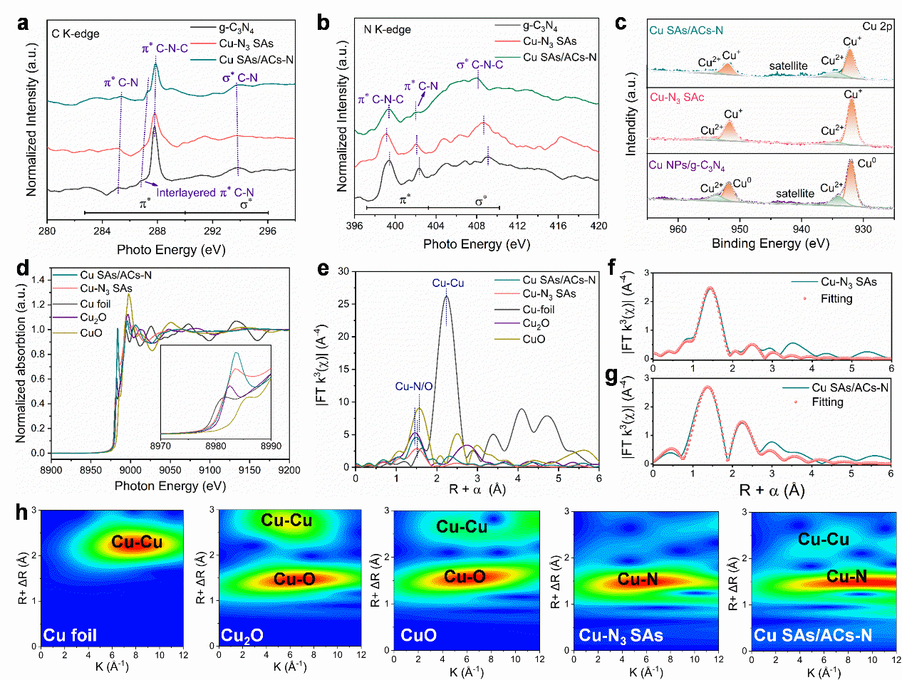 圖1. Cu-N3 SAs及其對比樣的C K邊XANES光譜(a)、N K邊XANES光譜(b)、Cu 2p的高分辨XPS光譜(c)、Cu K邊XANES光譜(d)、Cu-K 邊的 k3加權 FT-EXAFS 光譜(e);(f)Cu-N3 SAs的Cu K邊R空間EXAFS光譜;(g)Cu SAs/ACs-N 的Cu K邊R空間EXAFS光譜;(h)Cu-N3 SAs及其對比樣的Cu K邊小波變換圖。