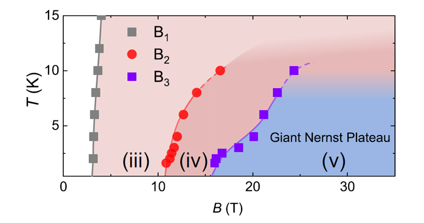 近日,中國科學院合肥物質(zhì)院強磁場中心低功耗量子材料團隊聯(lián)合中國科學技術大學、南方科技大學團隊,依托穩(wěn)態(tài)強磁場實驗裝置所屬水冷磁體WM5,利用強磁場在弱拓撲絕緣體中成功構建出理想一維外爾半金屬相,并觀測到由該相特有熱電轉(zhuǎn)換機制導致的巨大能斯特平臺。相關研究成果《Observation of Giant Nernst Plateau in Ideal 1D Weyl Phase》發(fā)表于美國物理學會期刊Physical Review Letters上。